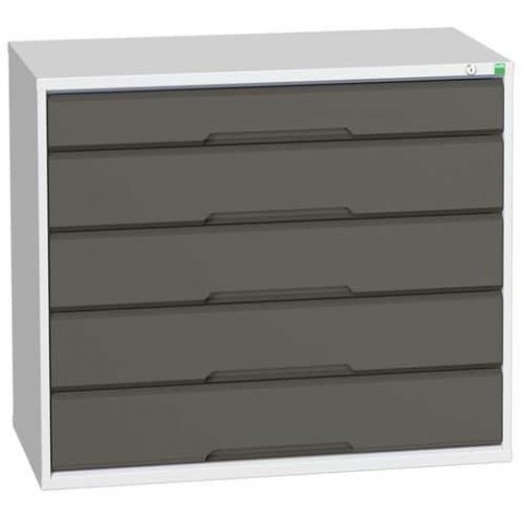 Kovové dílenské skříně Bott Verso se zásuvkami pro efektivní využití v provozech a dílnách. Zásuvky s nosností 75 kg a 100% výsuvy na válečkových ložiskách. Svařovaná ocelová konstrukce, povrchová úprava práškovým lakem. Centrální uzamykání cylindrickým zámkem se dvěma klíči.Dílenské zásuvkové skříně Bott Verso, výška 90 cm, 5 zásuvek