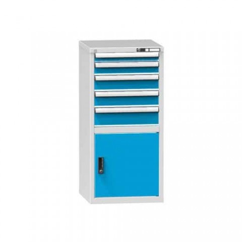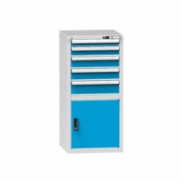 Zásuvkové skříně jsou vyráběny z kvalitních ocelových plechů. Součástí je mechanismus centrálního zamykání a blokace zásuvek. Standardně jsou zásuvkové skříně osazeny cylindrickými zámky a ke každému zámku jsou dodávány dva klíče. Skříňka je opatřena jednou vnitřní policí a dvířkami o rozměrech 550 mm. K dostání ve 3 barevných variantách - modrá, tmavě modrá, šedá.Dílenské zásuvkové skříně ZA, 1215 x 578 x 600 mm, 5 zásuvek, 1 skříňka, šedá