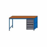 Součástí dílenského stolu jsou dva samostatné kontejnery, které jsou jako jeden celek zavěšené pod pracovní plochu. Kontejnery jsou centrálně uzamykatelné cylindrickým zámkem na klíč. Všechny zásuvky jsou 100% vysouvatelné. Pracovní deska o tloušťce 21 mm je vyrobena z bukové překližky v přírodním provedení. Částečně svařovaná konstrukce a kostra pracovního stolu z uzavřených profilů zajišťují dobrou stabilitu. Nohy stolu jsou opatřeny vyrovnávacími šrouby, které slouží pro vyrovnání nerovností v podlaze. Stůl je dodáván v rozloženém stavu, kontejnery jsou zkompletovány. Rozměr pracovní desky 2,1 x 200 x 70 cm. Rozměry kontejneru 32,5 x 44 x 64 cm. Podnoží vytvořeno z ocelového profilu 30 x 30 mm.Dílenský stůl Asse, 76 x 200 x 70 cm