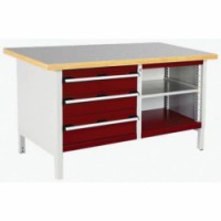 Dílenské stoly Bott Cubio s šířkou 150 cm a pracovní deskou multiplex nebo linoleum. Nosnost až 800 kg, robustní svařovaná ocelová konstrukce, povrchová úprava práškovým lakem. Pracovní deska tloušťky 4 cm typu multiplex nebo linoleum. Centrálně uzamykatelné zásuvky s výškou 2 x 15 a 1 x 20 cm, nosností 75 kg a 100% výsuvem na válečkových ložiskách. V otevřené části pozinkovaná výškově stavitelná police s nosností 100 kg.Dílenský stůl Bott Cubio Storage, 84 x 150 x 75 cm, 3 zásuvky, otevřený prostor s policí, linoleum/multiplex