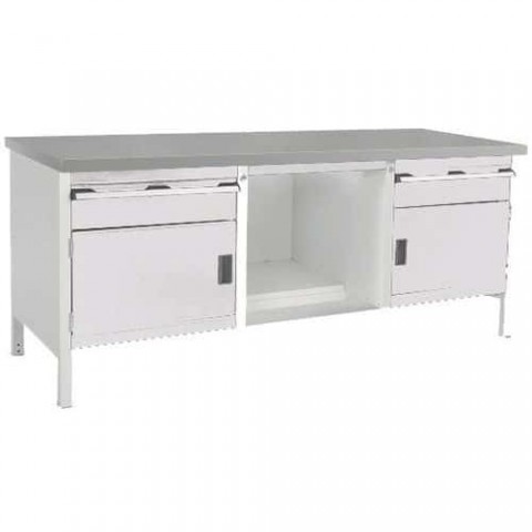Dílenské stoly Bott Cubio Storage s pracovní deskou tloušťky 4 cm typu multiplex nebo linoleum. Nosnost až 800 kg, robustní svařovaná ocelová konstrukce, povrchová úprava práškovým lakem. Centrálně uzamykatelné zásuvky s výškou 2 x 15, nosností 75 kg a 100% výsuvem na válečkových ložiskách. Uzamykatelé skříňky s výškou dveří 35 cm, uvnitř pozinkovaná výškově nastavitelná police s nosností 100 kg.Dílenský stůl Bott Cubio Storage, 84 x 200 x 75 cm, 2 skříňky, 2 zásuvky, police, multiplex/linoleum