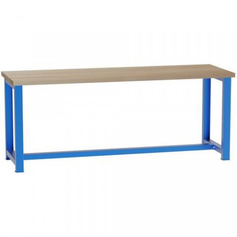 Pracovní stůl vhodný do dílen, servisních pracovišť a provozů. Pracovní deska je vyrobená z bukové spárovky tl. 4 cm se sraženými hranami. Stabilní ocelová konstrukce tl. 0,7 - 4 mm. Maximální nosnost stolu při rovnoměrném zatížení je až 500 kg. Podnoží v modrém provedení RAL 5012. Součástí balení je montážní materiál.Dílenský stůl Work, 84 x 210 x 68,5 cm