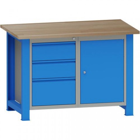 Pracovní stůl vhodný do dílen, servisních pracovišť a provozů. Vybavený uzamykatelným boxem a třemi zásuvkami. Kontejner má rozměry 70 x 48 x 61 cm, zásuvky 2 x 17,1 x 26 cm. Pracovní deska je vyrobená z bukové spárovky tl. 4 cm se sraženými hranami. Stabilní ocelová konstrukce tl. 0,7 - 4 mm. Maximální nosnost stolu při rovnoměrném zatížení je až 900 kg. Podnoží v modrém provedení RAL 5012. Součástí balení je montážní materiál.Dílenský stůl Work se skříňkou a 3 zásuvkami, 84 x 120 x 68,5 cm