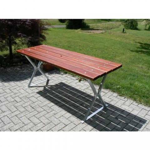 Parkový piknikový stůl s pozinkovanou kovovou konstrukcí a dřevěnou deskou upravenou lazurovacím lakem. Možnost ukotvení k zemi. barva desky: hnědá barva konstrukce: ??edá rozměry desky d x h: 180 x 64 cm výška stolu: 74 cm materiál desky: smrkové fošny, tl. 35 mm materiál konstrukce: ocel, tl. 42 mmDřevěný zahradní stůl Miguel