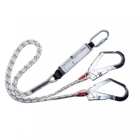 Dvojité lano s hákem a karabinou. Délka 180 cm včetně konektorů. CE-KAT IIIDvojité lano Kernmantle s tlumičem pádu, bílá