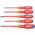 Sada izolovaných elektrikářských šroubováků pro práci pod napětím do 1000 V. Zvýšená odolnost proti opotřebení. Měkká rukojeť pro větší pohodlí a odolnost vůči chemikáliím. Díky povrchové úpravě čepele (zinek-nikl-chrom) jsou šroubováky až čtyřikrát odolnější proti korozi. Obrábění pomocí CNC zajišťuje lepší nastavení šroubu, tedy větší přenos točivého momentu a menší opotřebení.Sada elektro šroubováků Protwist, 5 ks