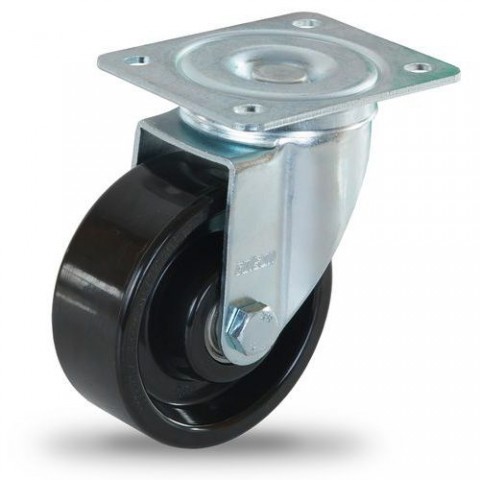 Pojezdové kolo vhodné do vlhkého prostředí s vysokými teplotami. Vidlice vyrobená z galvanizované oceli, běhoun z fenolové pryskyřice. Odolné vůči oděru, větší redukce hluku. Pro dlouhou životnost kola je vhodné promazávat vidlice alespoň 1x ročně. Montáž kola je doporučena na nástavec, nikoliv přímo k pevné desce.Fenolové transportní kolo s přírubou, průměr 100 mm, otočné, kuličkové ložisko