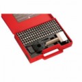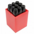 tyto znaky jsou určeny pro profilové značení perfektní kalibrace a vybroušení znaků jejich přesné sestavení do razidla pro ruční značkování kladivem nebo strojní značkování v lisu levý profil, ostrý, velká abeceda nástrojová ocel, tvrdost 58 - 60 HCR, niklovaná sada 100 ks znaků + 20 upínek kufřík obsahuje: 1 razidlo pro 1 řádek textu, razidlo je z tažené oceli s úderníkem pro kladivo (na vyžádání držák pro upevnění do lisu), 1 klíč imbus, 1 sázečské kleště s rozpětím 3 mm znaky jsou uspořádány v plastikovém kufříku červené barvyKufřík výměnných razidel