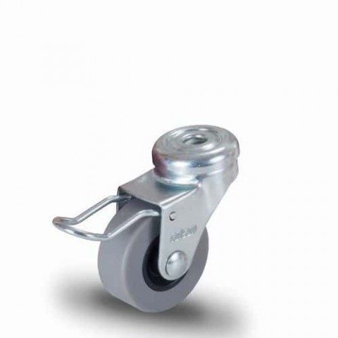 Otočná kola s šedým běhounem z termoplastické pryže s vysokou chemickou odolností. Odolný běhoun nepoškozuje a nešpiní povrch. Vybavené kluznými ložisky. Tvrdost běhounu je 75° Shore A.Gumová termoplastická transportní kola se středovým otvorem, průměr 30 - 40 mm, otočná, kluzná ložiska