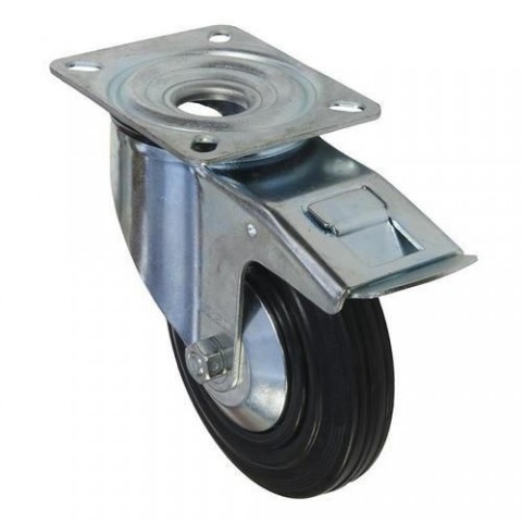 Transportní otočná kola s černou pryžovou obručí. Kryt proti namotávání vláken, nízký rozjezdový odpor. typ kol: otočná s brzdou materiál kol: guma průměr kola: 80 - 200 mm šířka kola: 25 - 50 mm nosnost: 50 - 200 kg způsob uchycení: vidlice s přírubou výška kola s vidlicí: 105 - 235 mm vyložení kola: 38 - 67 mm ložiska: valivá (kuličková) disk proti namotávání vláken, povrchová úprava pozinkováním, odolnost proti teplotě od -20 do +80 °CGumová transportní kola s přírubou, průměr 80 - 200 mm, otočná s brzdou, valivá ložiska