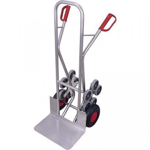 Hliníkový rudl na schodiště pro přepravu břemen. Pětihvězdicová kola z šedé termoplastické pryže na plastovém ráfku. Rozměry lopaty 480 x 300 mm. Vyrobeno ze svařovaných hliníkových trubek. Plastová madla s bezpečnostní ochranou zamezující poranění rukou. Pneumatiky na ocelovém ráfku nebo celopryžová kola na speciálním plastovém ráfku s přesnými kuličkovými ložisky a plastovým krytem kola.Hliníkové schodišťové rudly RU221, do 200 kg, 61 x 72,5 x 131 cm