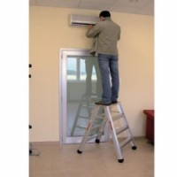Skládací oboustranné schůdky vhodné pro profesionální použití. Protiskluzový rýhovaných povrch stuňů, vzdálenost mezi stupni je 22 cm. Opatřené ochrannými patkami.Hliníkové schůdky Camel s plošinou, oboustranné, 2 x 4 stupně