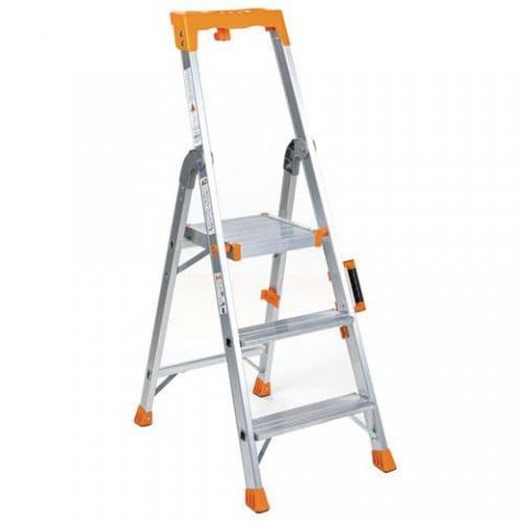 Skládací hliníkové schůdky s jednostranným vstupem, vhodné pro stavební práce nebo do skladu. Na boku jsou opatřeny držákem pro snadnější přenos a pojistkou proti nechtěnému sklpení při přemísťování. Součástí madla je praktická polička na odkládání nářadí a drobných předmětů, včetně úchytu na kbelík. Protiskluzový rýhovaný povrch stupňů, vzdálenost mezi stupni je 25 cm. Splňují normu EN 131-1, EN 131-2/A2, EN 131-3.Hliníkové schůdky s držákem, 3 stupně - Manutan Expert