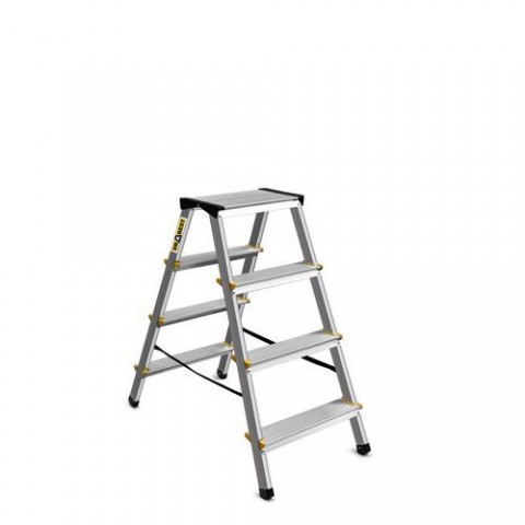 Skládací oboustranné schůdky vhodné do domácností, skladů nebo archívů. Protiskluzový rýhovaný povrch stupňů, vzdálenost mezi stupni je 23 cm. Opatřené ochrannými protiskluzovými patkami. Splňují normu ČSN EN 131 a mají TÜV certifikát. Nosnost 150 kg.Hliníkové schůdky Verona BY s plošinou, oboustranné, 2 x 4 stupně