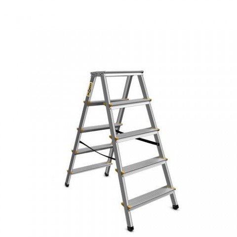Skládací oboustranné schůdky vhodné do domácností, skladů nebo archívů. Protiskluzový rýhovaný povrch stupňů, vzdálenost mezi stupni je 23 cm. Opatřené ochrannými protiskluzovými patkami. Splňují normu ČSN EN 131 a mají TÜV certifikát. Nosnost 150 kg.Hliníkové schůdky Verona BY s plošinou, oboustranné, 2 x 5 stupňů