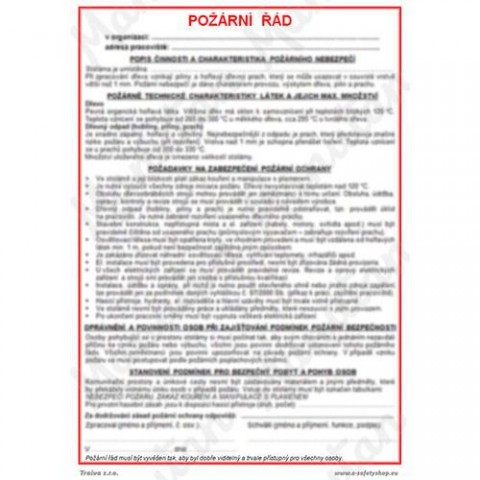 Bezpečnostní značení tabulkou, značkou nebo samolepkou "Požární řád" je tištěno na vysoce kvalitním materiálu, barvami s vysokou odolností proti otěru a UV záření. Tak, aby provedení značení bylo plně v souladu s Nařízením vlády č. 375/2017 Sb., ČSN ISO 3864 a ČSN ISO 3864-1.Informační tabulky - Požární řád archív