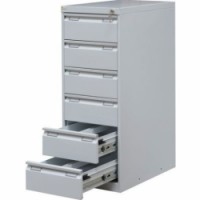 Kovové kartotéky se šesti zásuvkami. Pevná ocelová konstrukce, blokace zásuvek. barva: světle šedá, modrá; korpus šedý formát: A6 počet zásuvek: 6 výsuv zásuvek: 100% nosnost zásuvky: 30 kg provedení: jednořadé rozměry v x š x h: 101,2 x 40 x 62,3 materiál: ocelový plech zámek: centrální cylindrický zámek povrchová úprava práškovým lakem, blokace proti vysunutí více zásuvek najednou, zámek se dvěma klíči, zkompletovánoJednořadé kovové lístkovnice A6 Stour, 6 zásuvek