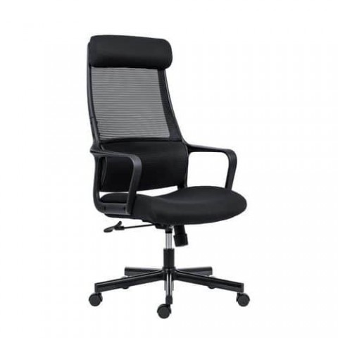 Kancelářská židle Faro s vysokým prodyšným opěrákem potaženým černou síťovinou. Měkký pohodlný sedák s výškou čalounu 10 cm. Výškově nastavitelná opěrka hlavy v rozsahu 0 - 6 cm. Výškově stavitelná bederní opěrka. Houpací mechanismus s aretací v základní poloze a nastavením síly protiváhy. Úhel naklápění opěráku 90° až 115°. Židle je osazena plastovými kolečky o velikosti 50 mm, která jsou vhodná pouze na měkké typy podlah (např. koberce). Pětiramenný ocelový černý kříž s dostatečně širokou základnou pro maximální stabilitu a oporu. Součástí židle jsou plastové područky, pevné bez jakékoliv možnosti nastavení. Výška područek od podlahy je v rozmezí 64,5 - 71,5 cm. Kancelářská židle vhodná pro domácí kancelář - ideální pro příležitostné sezení u PC. Celková výška židle je 112,5 - 119,5 cm. Složení potahové látky a síťoviny: 100% polyester.Kancelářská židle Faro, černá