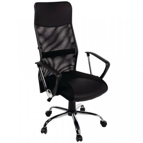 Manažerská kancelářská židle se sedákem čalouněným černou látkou a černou koženkou. Horní část opěradla ze 100% polyesterové síťoviny s polstrovanou opěrkou hlavy a černým čalouněním z imitace kůže. Čalouněný sedák z polyuretanové pěny o hmotnosti 30 kg/m3. Výškově nastavitelná bederní opěrka. Centrální mechanismus sklápění s nastavitelným tahem, který lze uzamknout v dané poloze. Pevné chromované područky. Chromovaná ocelová základna a kolečka pro kobercové podlahy.Kancelářská židle Gallo s područkami