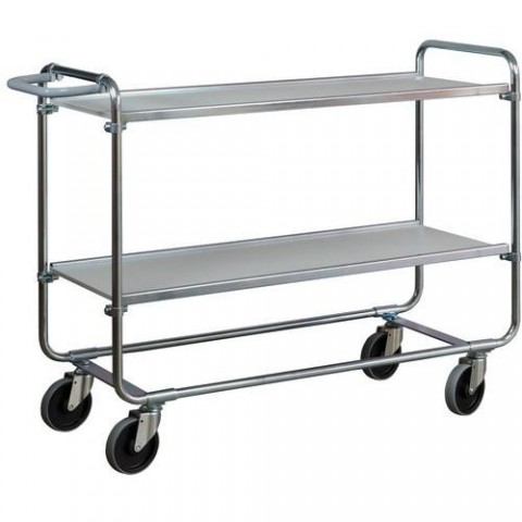 Policové vozíky se dvěma policemi vhodné do kanceláří pro přepravu šanonů, archů a jiného kancelářského materiálu. Police je možné nastavit do libovolné výšky nebo je z vozíku zcela vyjmout. Hrana polic o výšce 25 mm zabraňuje nežádoucímu vypadávání předmětů z vozíku, deska je pokrytá laminátem šedé barvy. Manipulaci usnadňuje madlo, které je možné naklánět dle potřeby uživatele. Pojízdnost vozíku zajišťují čtyři otočná kola s kluznými ložisky. Běhoun koleček je vyroben z nešpinivé pryže. Povrchová úprava pozinkováním.Kancelářské policové vozíky Ergobjorn s madlem, do 150 kg, 2 police s vyvýšenými hranami