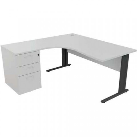Ergonomické stoly se základnami v antracitové barvě a ve tvaru L. Možnost výběru z pravého či levého provedení. Vrchní část s antireflexní povrchovou úpravou. Součástí desky stolu je průchodka pro vedení kabelů. Kontejner se třemi zásuvkami je dodáván se dvěma klíči.Kancelářské stoly s kontejnerem Manutan Expert, 72 x 160 - 180 x 160 cm, pravé/levé provedení, světle šedá
