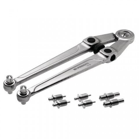 Pro matice s horními otvory. Klíč se nastavuje jako kompas působením na středový šroub. Odnímatelná dvojitá a kulatá oka. Každý klíč se dodává se čtyřmi sadami po dvou kolících. Kapacita: od 20 do 100 mm. Délka: 245 mm. Saténově chromovaná povrchová úprava. Hmotnost: 0,530 kg.Klíč na matice s otvory, rozevření čelistí 100 mm