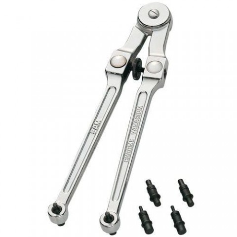 Kované z chrom-vanadiové oceli. K uchopení drážkovaných matic nebo matic s otvory na boku. Kapacita od 18 do 100 mm. Rychlé a přesné nastavení. Dodává se se sáčkem 6 oboustranných kolíků, referenční číslo 110.6. Chromovaná povrchová úprava.Klíč na matice s otvory Sam, rozevření čelistí 100 mm