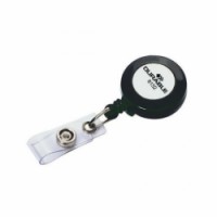Praktický systém s navíjecí šňůrou a popruhem se zacvakávacím knoflíkem. Kovový klip na zadní straně pro připevnění k oděvu nebo opasku.Klip na jmenovku s navíjecím lankem Durable, černá