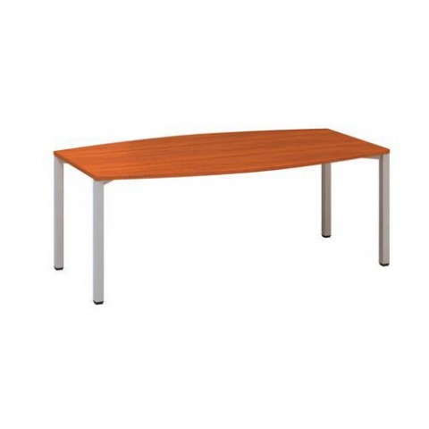Jednací stoly Alfa 420 v pěti barevných provedeních. Desky stolu jsou vyrobeny z laminované dřevotřísky tloušťky 25 mm s ABS hranou 2 mm. Rámové podnoží je tvořeno dvěma sestavami kovových nohou o průřezu 5 x 5 cm. Obě sestavy nohou jsou spojeny železným profilem, který rovněž slouží jako výztuha stolové desky. Šířka desky v užším místě je 80 cm. Kovové nohy jsou opatřeny rektifikací v rozsahu 15 mm pro vyrovnání nerovností podlahy. Konferenční stoly splňují normy ISO9001, ISO14001, ČSN18001, Ekologicky šetrný výrobek.Konferenční stoly Alfa 420 s šedým podnožím, 200 x 110 x 74,2 cm