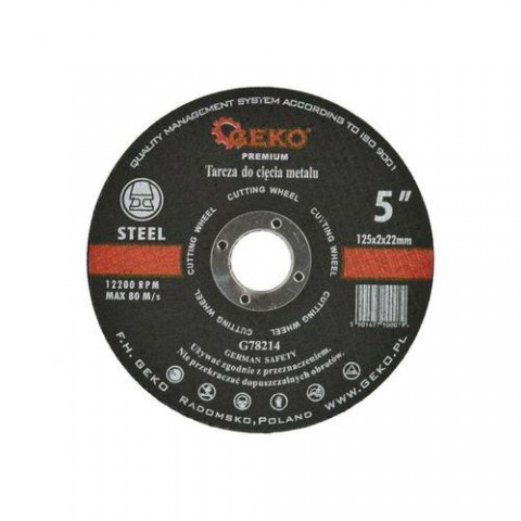 Kvalitní řezný kotouč na kov GEKO s rozměry 125 x 1,6 x 22,23 mm vhodný pro řezání prvků z konstrukční oceli, plechu, trubek a profilů. Extrémně houževnatá brusná zrna oxidu hlinitého zajišťují vysoký řezný výkon, jsou pojena syntetickou pryskyřicí a vyztužena skelnými vlákny, které prodlužují životnost a odolnost kotouče. Brusný materiál: elektrokorund. Průměr kotouče: 125 mm. Upínací otvor: 22,23 mm. Tloušťka: 1,6 mm. Max. otáčky: 12200 ot./min. Přípustná lineární rychlost: 80 m/s.Kotouč řezný na kov, 125x1,6mm GEKO