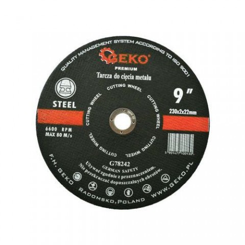 Kvalitní řezný kotouč na kov GEKO s rozměry 230 x 2 x 22,23 mm vhodný pro řezání prvků z konstrukční oceli, plechu, trubek a profilů. Kvalitní řezný kotouč na kov GEKO s rozměry 230 x 2 x 22,23 mm vhodný pro řezání prvků z konstrukční oceli, plechu, trubek a profilů. Praktický korundový kotouč pro řezání nerezové, normální a jemné oceli, neželezných kovů, hliníku a dalších kovů. Extrémně houževnatá brusná zrna oxidu hlinitého zajišťují vysoký řezný výkon, jsou pojena syntetickou pryskyřicí a vyztužena skelnými vlákny, které prodlužují životnost a odolnost kotouče. Brusný materiál: elektrokorund. Průměr kotouče: 230 mm. Upínací otvor: 22,23 mm. Tloušťka: 2 mm. Max. otáčky: 6600 ot./min. Přípustná lineární rychlost: 80 m/s.Kotouč řezný na kov, 230x2mm GEKO