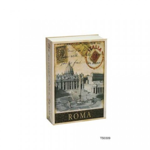 Kovová bezpečnostní schránka ve tvaru knihy. Hřbet knihy je autentický papír. Stránky knihy imitace papíru v plastovém provedení.Kovová bezpečnostní schránka ve tvaru knihy Roma