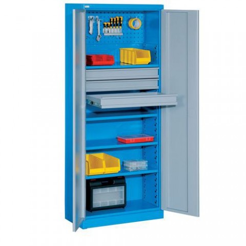 Uzamykatelná kovová skříň se třemi výškově nastavitelnými policemi a se třemi zásuvkami. Konstrukce je svařována z ocelového plechu. V horní části skříně se nachází perforovaný plech pro držáky nástrojů. Křídla dveří jsou po celé délce zpevněná výztuhami.Kovová dílenská skříň, 192 x 78 x 38 cm