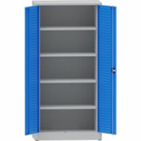 Kovová dílenská skříň se čtyřmi výškově nastavitelnými policemi. Skříň je možné uzamknout dvoubodovým cylindrickým zámkem. Robustní konstrukce je svařována z ocelového plechu. Dveře skříně jsou perforované.Kovová dílenská skříň, 195 x 95 x 50 cm