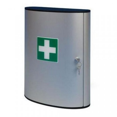Hliníková lékárnička na stěnu vhodná do kancelářských, dílénských nebo průmysových prostorů. Vybavená dvěma otočnými přihrádkami a jednou plastovou kapsou. Uzamykatelná cylindrickým zámkem, dodávána se dvěma klíči. Povrchová úprava práškovým lakem.Kovová nástěnná lékárnička, uzamykatelná, 40 x 30,2 x 11,8 cm