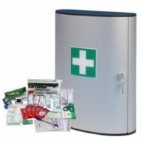 Hliníková lékárnička na stěnu vhodná do všech kancelářských a administrativních prostor, recepcí a pracovišť s běžnou mírou rizika úrazu. Vybavená dvěma otočnými přihrádkami a jednou plastovou kapsou. Uzamykatelná cylindrickým zámkem, dodávána se dvěma klíči. Povrchová úprava práškovým lakem.Kovová nástěnná lékárnička, uzamykatelná, 40 x 30,2 x 11,8 cm, s náplní KANCELÁŘ