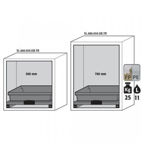 Nízká skříňka na skladování žíravých, zásaditých látek, kyselin a jiných chemikálií. Skříňka obsahuje záchytnou vanu pro objem 11 l. Uzamykání každého boxu cylindrickým zámkem, maximální nosnost je 25 kg. Povrchová úprava kovu práškovým lakem. Lze napojit na ventilaci pomocí přípojky 50 mm.Kovová nízká skříň na chemikálie, 600 x 570 x 590 mm