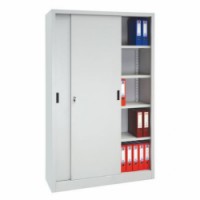 Skříň na šanony s posuvnými dveřmi. Výškově přestavitelné police. Cylindrický zámek, dva klíče. Chromovaná madla a plastové dorazy na dveřích.Kovová spisová skříň s posuvnými dveřmi, 4 police, 200 x 120 x 45 cm