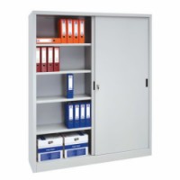 Skříň na šanony a spisy s posuvnými dveřmi. Výškově přestavitelné police. Cylindrický zámek, dva klíče. Chromovaná madla a plastové dorazy na dveřích.Kovová spisová skříň s posuvnými dveřmi, 8 polic, 200 x 160 x 45 cm