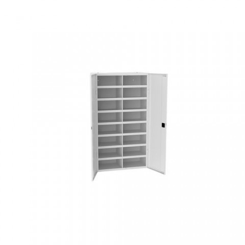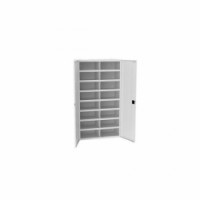 Kovové dílenské skříně s přihrádkami jsou vyrobeny z ocelového plechu o tloušťce 0,8 mm. Skříně obsahují 16 přihrádek s rozměry 180 x 455 x 500 mm. Dveře s možností uzamčení pomocí dvoubodového cylindrického zámku. Vhodné jsou zejména pro ukládání dílenského materiálu (např. nářadí) v dílnách, garážích apod. Vysoká odolnost proti korozi díky povrchové úpravě práškovým lakem. Dodáváno ve smontovaném stavu.Kovové dílenské skříně s přihrádkami SFR162, 180 x 100 x 53 cm