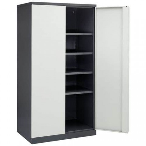 Svařovaná dílenská skříň z ocelového plechu tloušťky 1,2 mm, práškový lak. Police přestavitelné v rastru 24 mm. Uzamykání dvoubodovým cylindrickým rozvorovým zámkem. Dveře se otevírají do úhlu 180°.Kovové dílenské skříně Sofame, šedé/tmavě šedé
