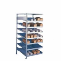 Kovové přístavbové regály se šikmými policemi jsou vhodné pro skladování zboží v boxech. Sklon polic 14 ° zvyšuje přehlednost a umožňuje rychlejší manipulaci s uloženým zbožím. Pomocí dodávaných vestavěných oddělovacích lišt může být zboží v jednotlivých drahách seřazeno podle velikosti.Kovové regály se šikmými policemi, přístavbové, 200 x 100 x 50 - 80 cm, 1 800 kg, 8 polic, stříbrné