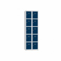 Plechové šatní skříně pro uložení drobných osobních věcí. Dveře jednotlivých boxů jsou uloženy na vnitřních pantech s úhlem otevření více než 90°. Šatníky jsou standardně vybaveny cylindrickým zámkem pro každou buňku (možnost zámku s cylindrickou vložkou nebo uzávěru pro visací zámky). Součástí jsou plastové háčky pro zavěšení uschovaných věcí. Větrací otvory ve dvířkách. K dostání ve třech barevných variantách.Kovové šatní skříně, 10 boxů, 1850 x 600 x 500 mm, šedá