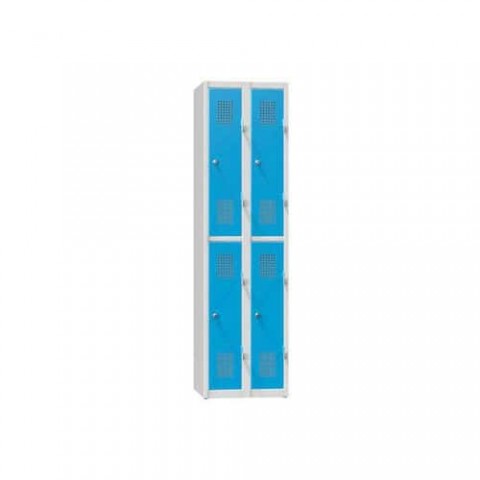 Půlené šatní skříně jsou dostupné ve výšce 1850 mm, šatníky jsou standardně vybaveny cylindrickým zámkem, dvěma klíči a třemi plastovými háčky. Plechové šatní skříně pro úsporu místa. Cylindrický zámek se dvěma klíči.Kovové šatní skříně 4-box na soklu, půlené, bez police, 600 x 500 x 1850 mm