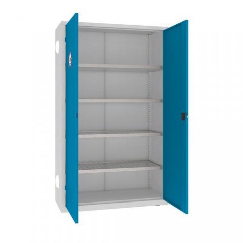 Svařované kovové skříně pro skladování chemikálií. Vybavené retenčními policemi s roštem s pozinkovaným povrchem, nastavitelné v rastru 25 mm. Monolitická svařovaná konstrukce z oceli tl. 1 mm zajišťuje vysokou pevnost. Křídlové dveře mají větrací otvory pro cirkulaci vzduchu a jsou opatřené štítkem GHS-02 pro standardní identifikaci chemického nebezpečí. Tříbodový zámek RONIS (dodáváno se 2 klíči). Vyrovnávací nožky, které jsou nastavitelné zevnitř. Posuvníky pro snadný pohyb skříně a ochranu podlahy. Pro vysokou bezpečnost lze přikotvit ke zdi. Před lakováním jsou skříně potaženy zirkoniovou vrstvou, která je chrání před korozí a zvyšuje přilnavost laku. Skříně jsou opatřené nátěrem, který má klasifikaci reakce na oheň: A2-s1, d0 dle norem PN-EN 13501-1:2019-02. Vyráběno v souladu s normami ISO:9001 a ISO:14001.Kovové skříně na chemikálie, 199 x 120 x 50 cm
