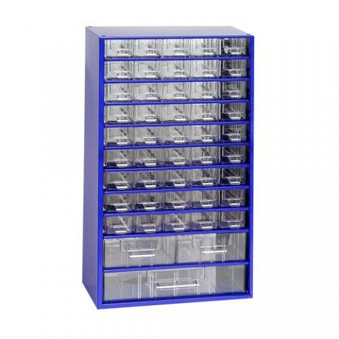 Kovový zásobník se zásuvkami slouží k přehlednému skladování drobných předmětů a součástek. Kombinací skříněk lze vytvořit kompaktní skladovací celek. K dispozici ve dvou barevných variantách. Skelet zásobníku je vyroben z ocelového plechu. Možnost zavěšení. Montážní materiál je součástí balení.Kovový organizér, 48 zásuvek