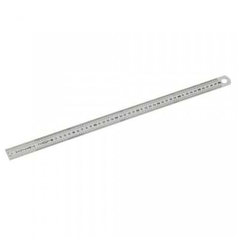 Gravírování na obou stranách. Jedna strana v mm – Jedna strana v 1/2 mm. 18 % Cr, 8 % Ni nerezová ocel. Ošetřeno proti odleskům. Třída II, v souladu s předpisy pro pravítka o délce 500 mm nebo větší.Krátká polotuhá pravítka z nerezové oceli - oboustranná