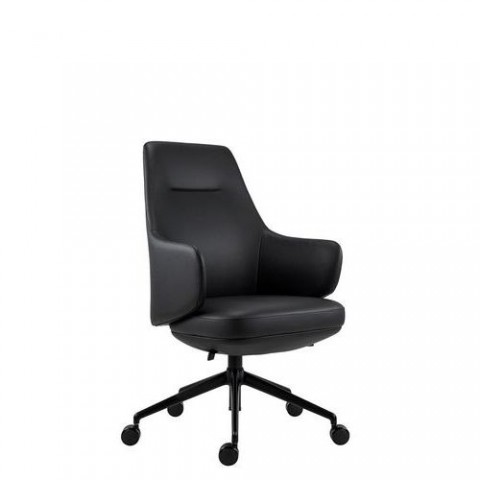 Celočalouněné luxusní křeslo se středně vysokým opěrákem a integrovanými čalouněnými područkami. Opěrák s bočním vedením trupu a optimální bederní podporou. Potah na dotykových partiích z jemné hovězí kůže, ostatní plochy ze syntetické kůže - microfiber leather. Široký, velice pohodlný sedák s jemným perforováním na bocích, pro zvýšení prodyšnosti. Čalounění ze studené pěny vstřikované do formy s vysokou životností. Synchronní mechanismu s automatickým nastavením síly protiváhy a trojnásobnou aretací. Hliníkový kříž o O700 mm lakovaný matnou černou barvou. Kolečka O 60 mm s gumovou obručí pro všechny typy podlah. Nosnost křesla 150 kg.Křeslo GLORIA MEDIUM BLACK