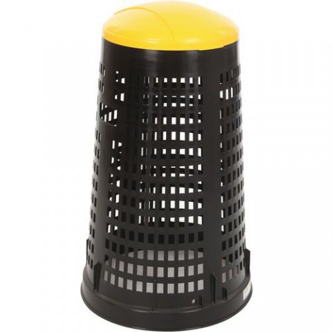 Koš na pevný odpad s tělem ze síťoviny z polyprolylenu. S držákem na sáčky a barevným víkem. Základna z recyklovaného materiálu. Snadná instalace nožního pedálu a volitelná základna na kolečkách.Kruhový perforovaný plastový odpadkový koš Ruff – 110 l – Vepabins