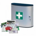 Nástěnná kovová lékárnička vhodná do kancelářských a administrativních prostor. Opatřená protiprachovým těsněním ve dvířkách. Vybavena dvěma policemi a dvěma přihrádkami ve dvířcích. Uzamykatelná lamelovým zámkem. Povrchová úpra bílým komaxitem.Kovová nástěnná lékárnička, uzamykatelná, 45 x 35 x 15 cm, s náplní KANCELÁŘ